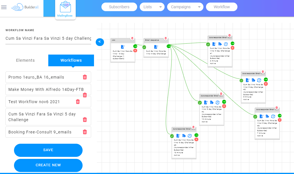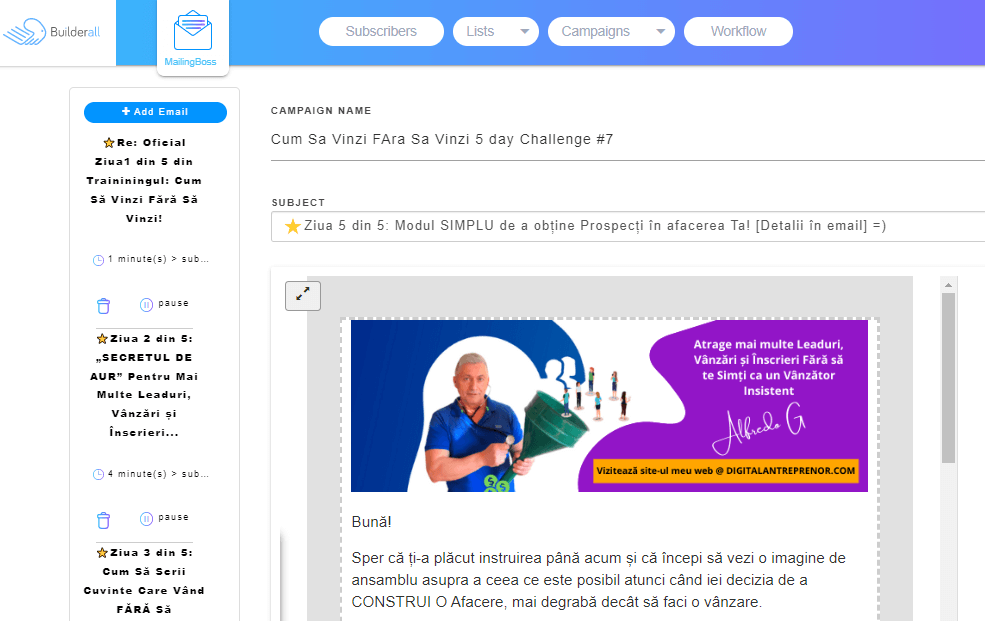 2.MailingBoss 5.0 Builderall Autoresponder - MailingBoss 5.0 este un software foarte avansat de automatizare a marketingului prin e-mail care-?i permite s? creezi r?spunsuri automate, s? configurezi campanii de email marketing ?i s?-?i construiesti lista de e-mail. Î?i permite s? capturezi un num?r Nelimitat de abona?i pentru a te ajuta s?-?i dezvol?i afacerea.De asemenea, simplific? crearea campaniilor de e-mail datorit? elementelor ?i ?abloanelor pre-proiectate. Este integrat cu toate celelalte instrumente de pe platforma.