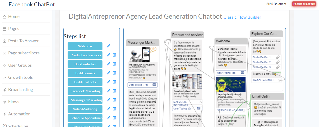 Cu ChatBot Messenger, creezi ?i programezi automatiz?ri nelimitate pentru trimiterea de mesaje listei tale generând interac?iune cu clien?ii poten?iali ?i îmbun?t??ind conversia vânz?rilor.ând ?i f?r? interven?ia ta.