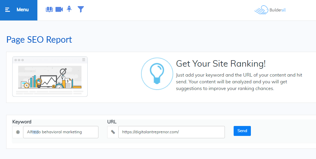 Instrumentul SEO on-page de la Builderall evalueaz? fiecare parte a optimiz?rii site-ului tau pentru motoarele de c?utare, oferindu-?i un scor ?i sfaturi despre cum s?-l îmbun?t??e?ti.